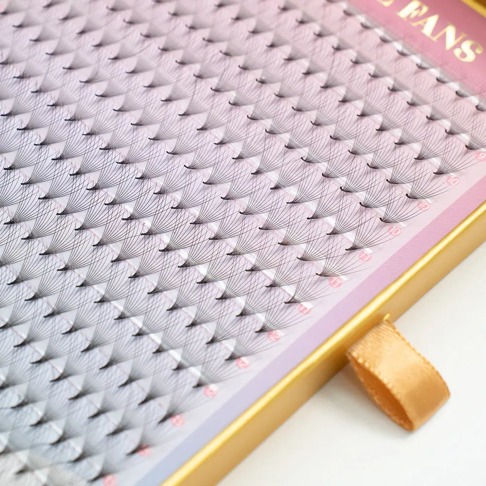 Time is money, especially in a busy salon. Our lashes are designed for quick and easy application. The heat-bonded pointy base makes grafting a breeze while retaining the lash curl for over a year. Choose from a wide range of lengths, from 8MM to 15MM, to give your clients a customized look that is both natural and strikingly beautiful. Our pre-made volume fans are conveniently packaged with 320 fans per tray, ensuring you won't run out in the middle of a busy day.
